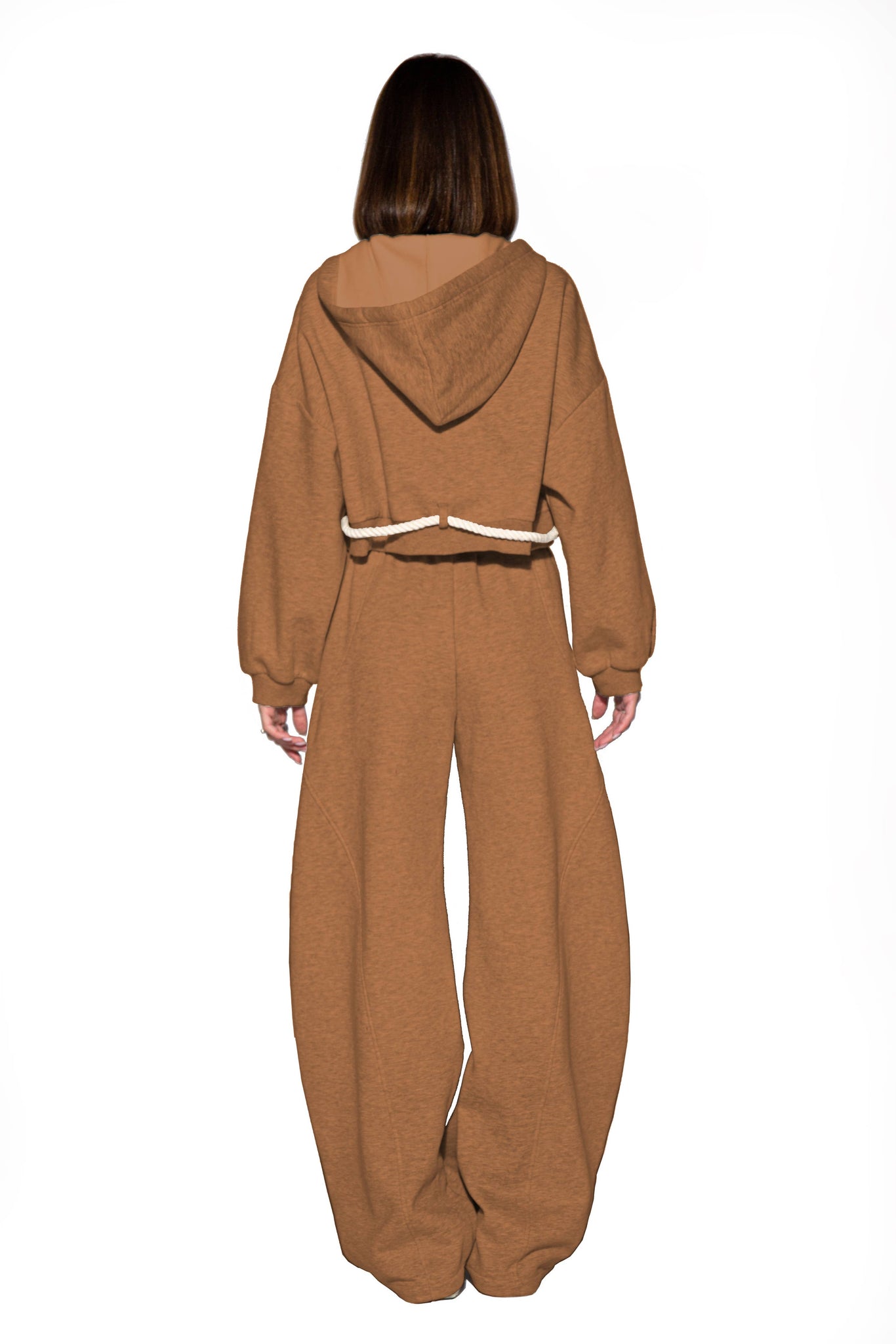 A fresh take on off-duty comfort with an avant-street edge. This matching zip-up hoodie and wide-leg sweatpant set elevates the classic fleece co-ord with statement rope details that cinch the waist and tie effortlessly at the front. The cropped hoodie and extra-relaxed pants create a bold silhouette that feels laid-back yet distinctly fashion-forward - perfect for styling up your streetwear rotation.